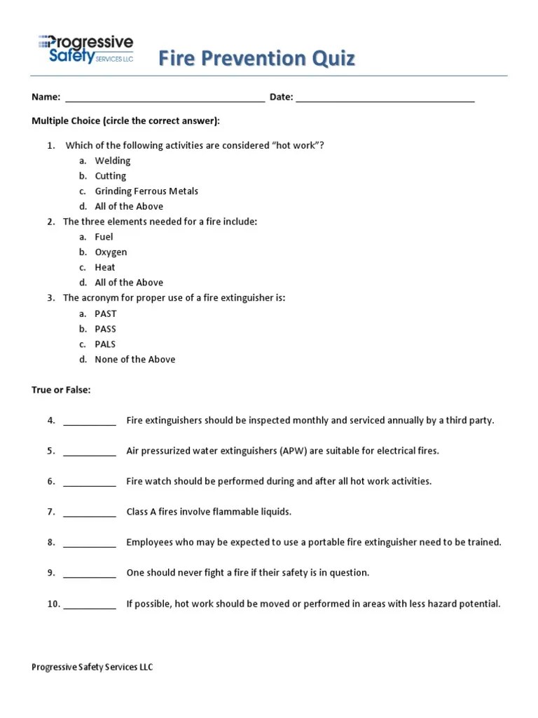 Fire Safety Quiz Printable - Take our short quiz and see how you score. Web these quizzes were created as a fun and approachable way to learn all you need to know about fire safety and prevention. Web test your fire prevention knowledge with fire safety quizzes from the fire equipment manufacturers' association. Workplaces with a minimum of ____ employees need to have a written fire prevention program in place. How much do you know about fire safety? Web fire extinguisher training quiz. An example of two “class b” fuels would be: Web the printable downloads are available as pdf files free of charge and may be printed or duplicated in reasonable quantities by. Fire safety trivia quiz questions and answers. Web fire safety quiz 1.