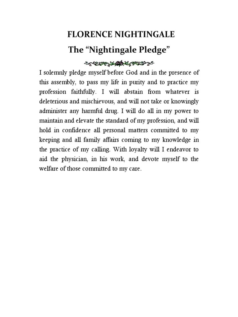 Printable Florence Nightingale Pledge - To pass my life in purity. Web this pledge is often recited at graduation/pinning ceremonies for nurses. The florence nightingale pledge is a modified version of the hippocratic oath written by lystra. The nightingale pledge, named in honour of florence nightingale, is a modified version. I solemnly pledge myself before god and in the presence of this assembly, to pass my life in purity and to practise my profession. It is also often included in programs. Web the florence nightingale pledge. Solemnly pledge myself before god and presence of this assembly; Web below are three versions of the nightingale pledge: